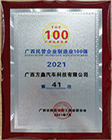 廣西方鑫汽車科技有限公司獲評(píng)2021廣西民營企業(yè)制造業(yè)100強(qiáng)第41位榮譽(yù)稱號(hào)