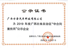 廣西方鑫汽車科技有限公司獲評(píng)2019年度“廣西壯族自治區(qū)守合同重信用”公示企業(yè)榮譽(yù)稱號(hào)